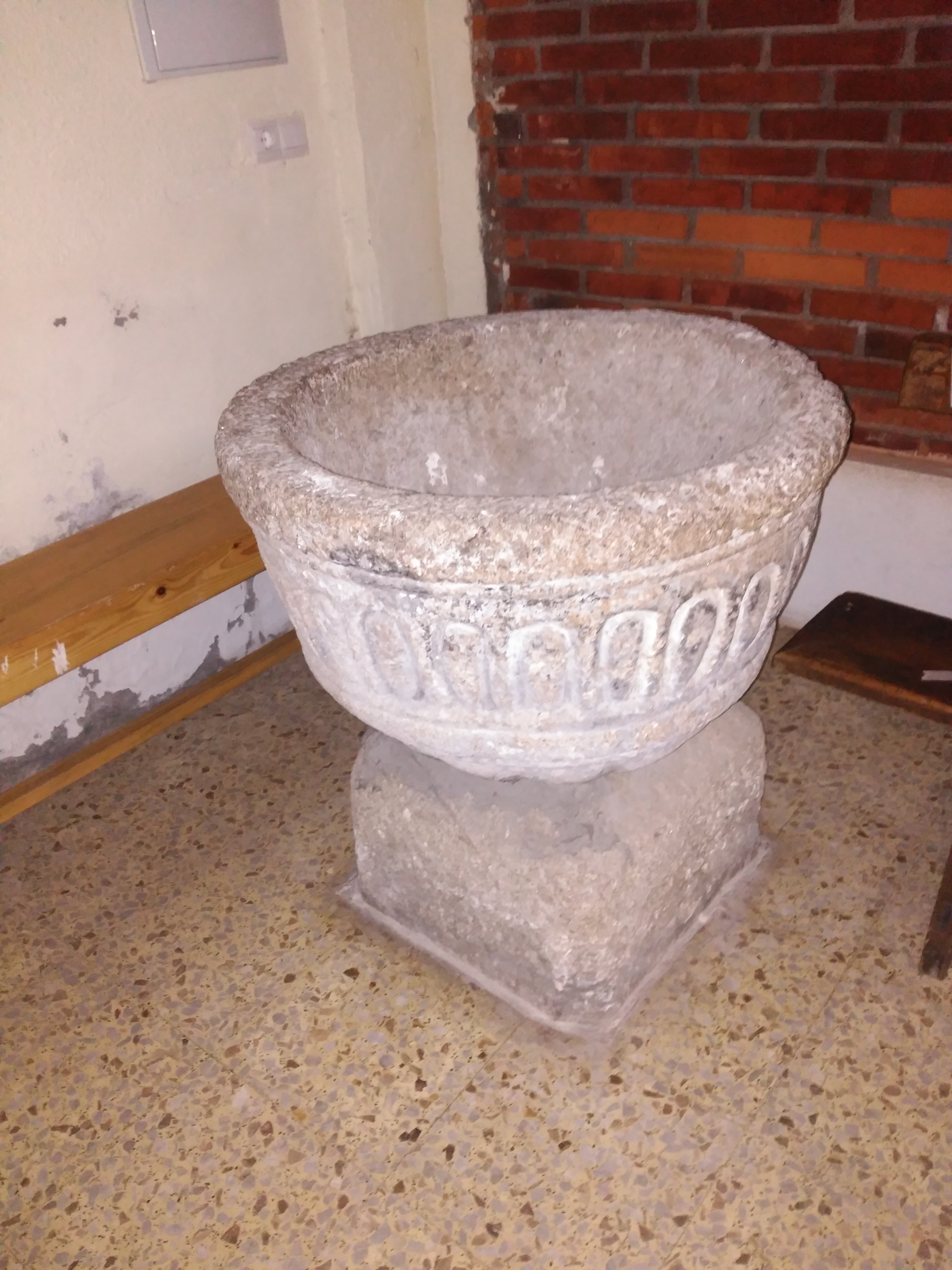 La pila bautismal y algunos bancos se trajeron de la Iglesia de San Pedro antigua cuando se demolió.